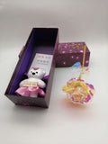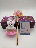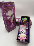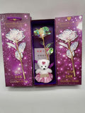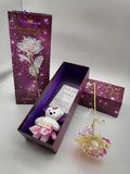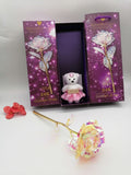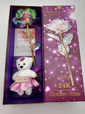 The teddy bear has a little sign saying "I love you", a cute pink skirt, and a heart-shaped headpiece. The rose has a 24K gold-plated stem with beautiful crystal-like petals and leaves.